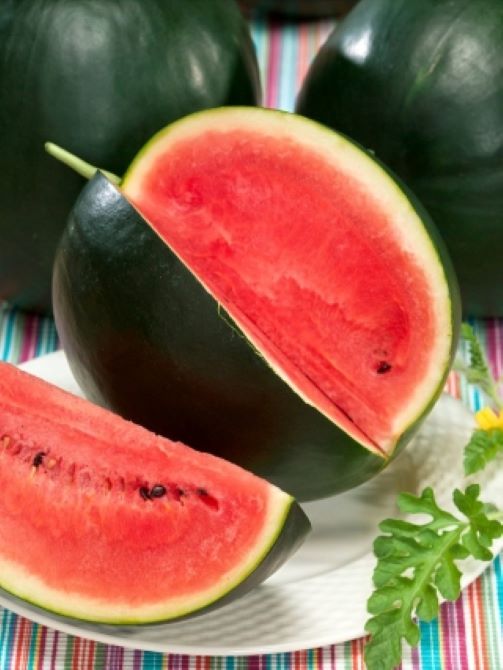 Owoce: Oferowana w naszym sklepie roślina rodzi bardzo duże owoce, kuliste bądź lekko jajowate w kształcie i pokryte grubą, ciemnozieloną skórką, odporną na uszkodzenia. Chroni ona wyśmienity, bardzo słodki miąższ, który przybiera apetyczny, czerwono-różowy kolor i cechuje się wysoką zawartością orzeźwiającego soku.