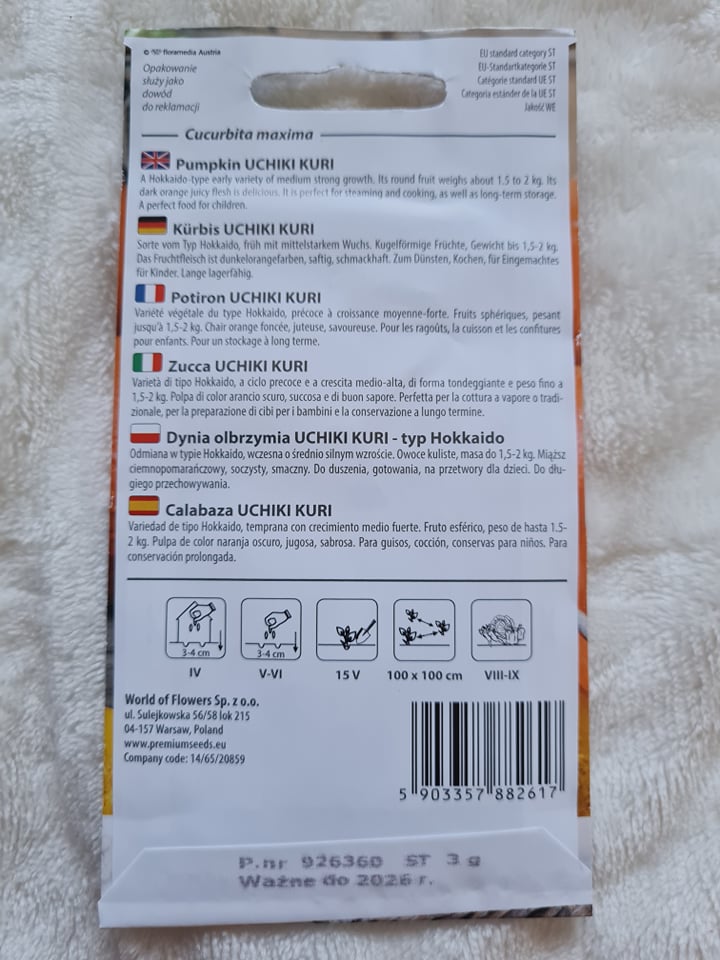 Dynia olbrzymia Uchiki Kuri w typie Hokkaido zyskała popularność nie tylko wśród fanów japońskiej kuchni. Pokocha ją każdy, ponieważ jej owoce posiadają wiele atutów. Przede wszystkim są bardzo smaczne, aromatyczne, wartościowe pod względem odżywczym, ale także niezwykle wytrzymałe na transport i długie przechowywanie. Nazwa: dynia olbrzymia Uchiki Kuri – typ Hokkaido Nazwa łacińska: Cucurbita maxima Uchiki Kuri, Hokkaido Forma życiowa: roślina jednoroczna Pokrój: Dynia olbrzymia charakteryzuje się silnym wzrostem – wytwarza wiele płożących się pędów. Rodzaj i kolor kwiatów: Na pędach, w kątach liści, rozwijają się duże, lejkowate, żółte kwiaty. Są rozdzielnopłciowe, co oznacza, że na jednej roślinie wyrastają zarówno kwiaty żeńskie, jak i męskie. Ulistnienie: Blaszki liściowe posiadają dużą powierzchnię, są szorstko owłosione i powcinane. Owoce: Uchiki Kuri to odmiana o małych jak na dynię olbrzymią owocach gruszkowatego kształtu, osiągających masę 1-1,5 kg. Ich ciemnopomarańczowy, bardzo smaczny miąższ pokryty jest dość grubą, pomarańczowoczerwoną skórką. Stanowisko: Pod uprawę warto wybierać słoneczne stanowiska z żyzną, raczej wilgotną, przepuszczalną i zasobną w składniki pokarmowe glebą o odczynie zbliżonym do obojętnego. Termin siewu i sadzenia: Siew nasion bezpośrednio do gruntu przeprowadzamy w maju, kiedy minie niebezpieczeństwo wiosennych przymrozków. Uprawę dyni można także rozpocząć od produkcji rozsady pod osłonami. Materiał siewny wysiewamy do doniczek pod koniec kwietnia, by młode roślinki posadzić w ogrodzie w drugiej połowie maja. Siew: W jednym dołku umieszczamy po 2-3 nasiona. Rozstawa: Zaleca się uprawę roślin w rozstawie 1 x 1 m. Termin zbioru i przechowywanie: Zbioru owoców należy się spodziewać od sierpnia do września. Co ważne, nadają się one do długotrwałego przechowywania, a także dobrze znoszą transport. Zastosowanie: Dostępna w sprzedaży w naszym sklepie dynia olbrzymia Uchiki Kuri w typie Hokkaido charakteryzuje się bardzo smacznymi i wartościowymi owocami. Znajdą one zastosowanie w kuchni jako składnik wielu potraw, np. zup, dań głównych, ciast czy sałatek. Doskonale nadają się również do przetwórstwa na soki, dżemy czy przeciery, a szczególnie do produkcji artykułów spożywczych dla dzieci i niemowląt. Ze względu na ciekawy, gruszkowaty kształt owoców i ciemnopomarańczowy kolor ich skórki, Uchiki Kuri posiada ponadto wyjątkowe walory dekoracyjne. Mrozoodporność: Dynia może nie przetrwać długo panujących chłodów. Należy chronić ją przed wpływem wiosennych przymrozków. W opakowaniu znajdują się 3 g nasion. Na odwrocie paczki zamieszczono informację o terminie przydatności nasion do siewu i wskazówki na temat uprawy roślin.
