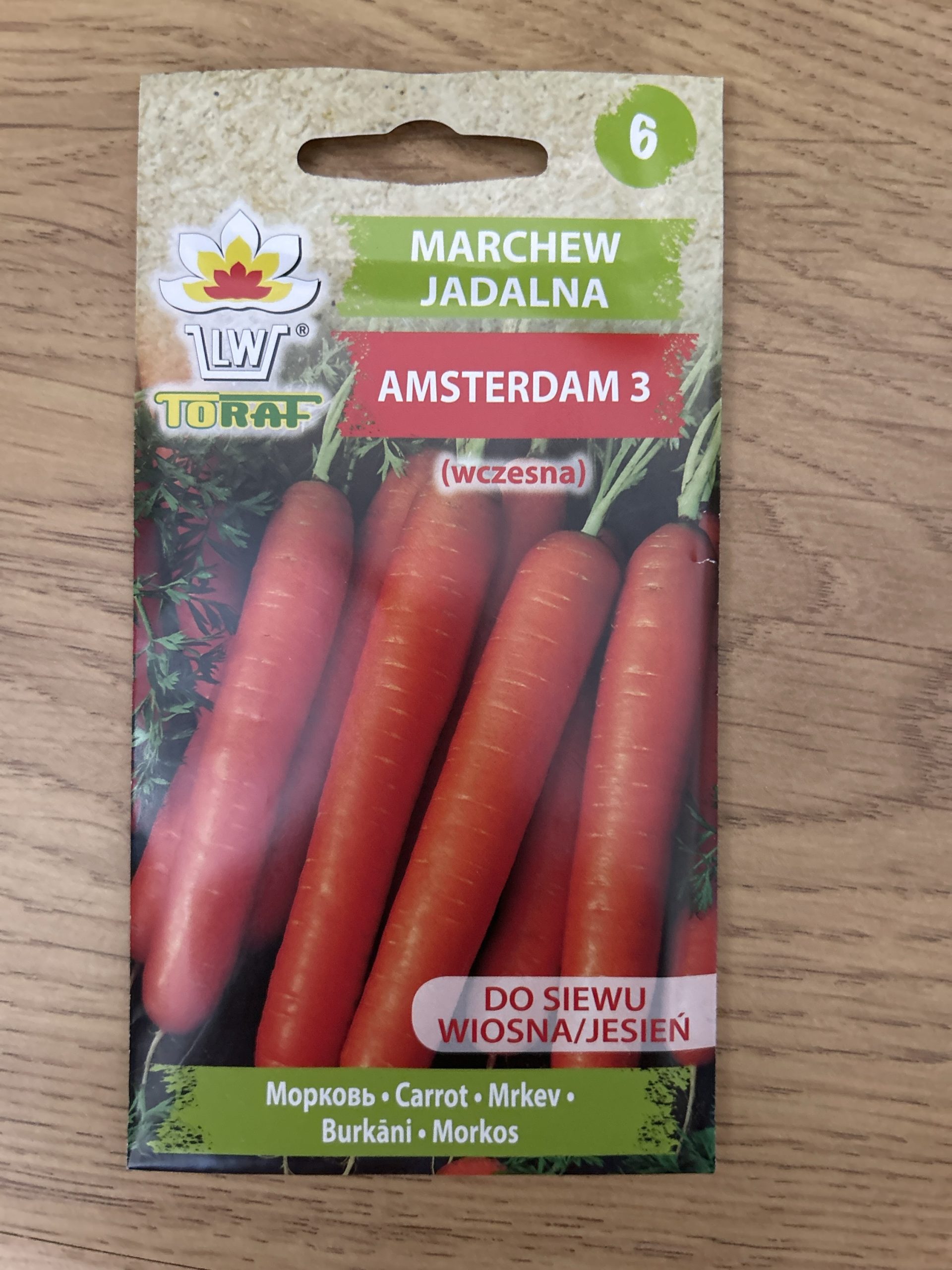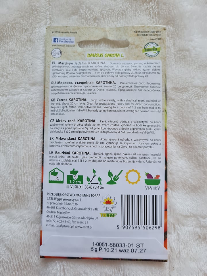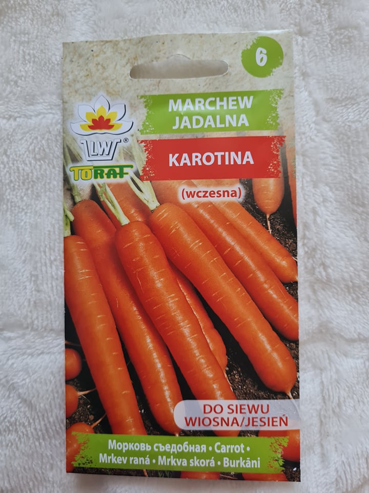 Opakowanie zawiera 5 g nasion marchwi Karotina, datę przydatności do siewu i zasady uprawy.